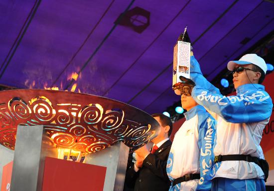 4月3日,在圣火传递终点――塔克希姆广场,护火手展示火种灯。当日,北京奥运会圣火境外传递第二站在土耳其伊斯坦布尔结束。
